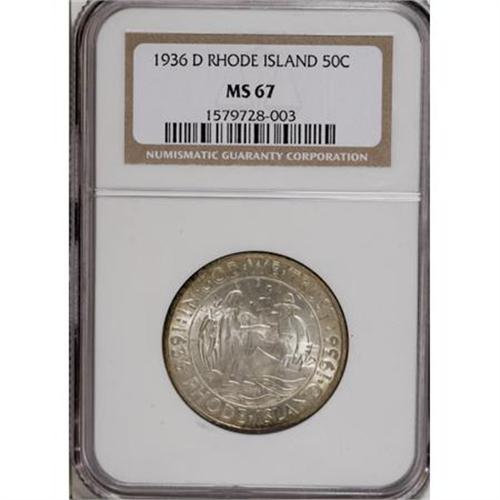 <B>1936-D 50C Rhode Island MS67 NGC.</B></I> Well-defined by the standards of this idiosyncratic issue with shining silver-gray and orange-gold patina, the latter appearing primarily at the margins. A pleasing representative from the Denver Mint. Census: 29 in 67, 3 finer (11/07).<BR><BR><b>Shipping:</b> Coins & Currency (<a target="_blank" href="http://www.heritageauctions.com/common/shipping.php">view shipping information</a>)
