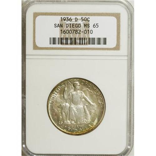 <B>1936-D 50C San Diego MS65 NGC.</B></I> NGC Census: (1359/404). PCGS Population (3896/762). Mintage: 30,092. Numismedia Wsl. Price for NGC/PCGS coin in MS65: $152. (#9372)<BR><BR><b>Shipping:</b> Coins & Currency (<a target="_blank" href="http://www.heritageauctions.com/common/shipping.php">view shipping information</a>\)