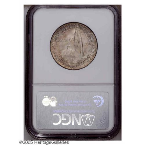 <B>1936-D<50C> San Diego MS66 NGC.</B></I> Well struck and satiny, with a deep coating of variegated tan, gold, green, and reddish coloration over both sides. A few minor marks are evident, but they are well concealed by the rich patina.