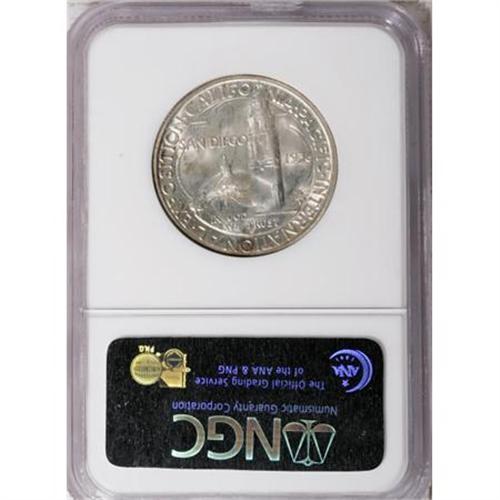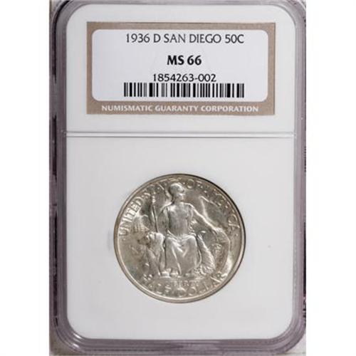 <B>1936-D 50C San Diego MS66 NGC.</B></I> NGC Census: (367/37). PCGS Population (696/66). Mintage: 30,092. Numismedia Wsl. Price for NGC/PCGS coin in MS66: $220. (#9372)<BR><I>From The Frank DuVall Collection of U.S. Commemoratives.</B></I><BR><BR><b>Shipping:</b> Coins & Currency (<a target="_blank" href="http://www.heritageauctions.com/common/shipping.php">view shipping information</a>\)