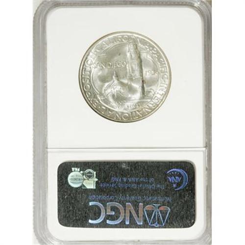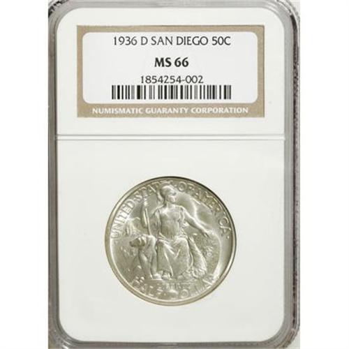 <B>1936-D 50C San Diego MS66 NGC.</B></I> Accompanying the lot are three circa-1965 postcards with different views of buildings constructed for the San Diego 1915 Pacific-California Exposition. NGC Census: (367/37). PCGS Population (696/66). Mintage: 30,092. Numismedia Wsl. Price for NGC/PCGS coin in MS66: $220. (#9372)<BR><I>From The Frank DuVall Collection of U.S. Commemoratives.</B></I><BR><BR><b>Shipping:</b> Coins & Currency (<a target="_blank" href="http://www.heritageauctions.com/common/shipping.php">view shipping information</a>\)