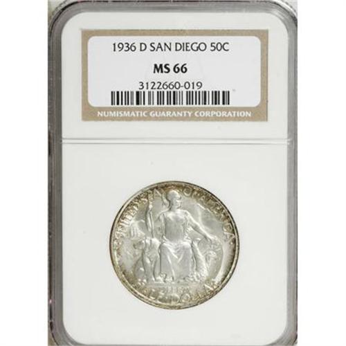 <B>1936-D 50C San Diego MS66 NGC.</B></I> . NGC Census: (377/41). PCGS Population (724/68). Mintage: 30,092. Numismedia Wsl. Price for NGC/PCGS coin in MS66: $220. (#9372)<BR><BR><b>Shipping:</b> Coins & Currency (<a target="_blank" href="http://www.heritageauctions.com/common/shipping.php">view shipping information</a>)