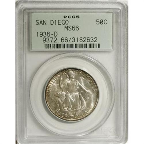 <B>1936-D 50C San Diego MS66 PCGS.</B></I> PCGS Population (715/66). NGC Census: (372/37). Mintage: 30,092. Numismedia Wsl. Price for NGC/PCGS coin in MS66: $220. (#9372)<BR><BR><b>Shipping:</b> Coins & Currency (<a target="_blank" href="http://www.heritageauctions.com/common/shipping.php">view shipping information</a>)