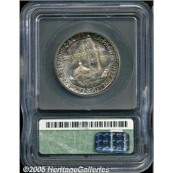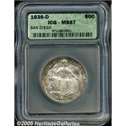 <B>1936-D 50C San Diego MS67 ICG.</B></I> Absolutely splendid color variations adorn each side of this impeccably preserved, sharply struck Superb Gem. The reverse is particularly attractive, as bright-green, purple, crimson, and orange patina is illuminated by vibrant, shimmering luster. Two or three contact marks can be found on obverse and reverse alike, but they are well concealed amidst the rich toning, and may only be visible with a magnifier.