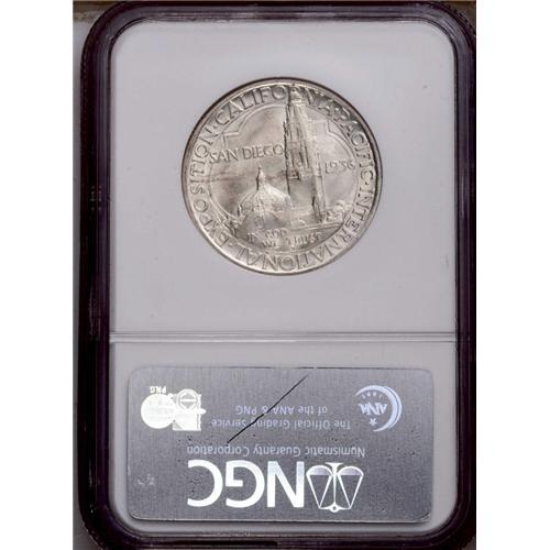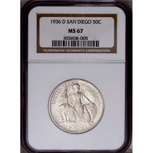 <B>1936-D<50C> San Diego MS67 NGC.</B></I> Delicately toned in tawny-gold tints. A lustrous and essentially immaculate Superb Gem. The grade is only limited by the usual slight striking softness along the right border of the observation tower, and on the knees and chest of Liberty. Census: 30 in 67, 1 finer (4/06).
