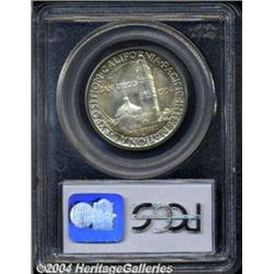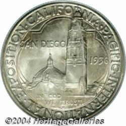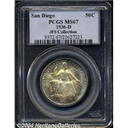 <B>1936-D<50C> San Diego MS67 PCGS.</B></I> Beautiful sea-green, apricot, and lavender colors enrich this nicely struck and magnificently preserved Superb Gem. Although no 1936-D San Diego Half is fully struck, the present piece has above average sharpness on the observation tower. Minor die doubling is noted on the obverse, visible on EVREKA and LIBERTY. Destined for the cabinet of a connoisseur of originally toned Silver Commemoratives. Population: 59 in 67, none finer (3/04).<BR><I>Ex: Long Beach Signature Sale (Heritage, 9/03), lot 9422, which realized $4,255.</B></I><BR><I>From the JFS Collection, the #1 All-Time PCGS Registry Set.</B></I> <BR><BR><B>Important notice:</B> Heritage usually auctions material at the rate of 200-250 lots per hour. On some occasions eBay Live bid software or the Internet may not be able to keep up with the pace of the auction. We recommend placing a realistic absentee bid now as insurance to avoid disappointment. Occasionally the auctioneer may eliminate or reject an eBay Live bid, and the auctioneer may also reopen a lot after the close of the eBay live bidding (usually because we missed an audience bid), and may reject your bid even if it shows you as the winning bidder. By bidding via eBay Live, you agree that Heritage may award the lot to another bidder at its sole discretion under the circumstances described above or any other reasonable circumstances. Since eBay bids are not shown to us until we open the lot on the floor, we treat those bids just like floor bids. In most cases the floor responds before the eBay bid is presented to us, due to Internet lag time, so for consistency we have made it a policy that floor bids are always considered first over tie eBay live bids. Also please note that all Heritage lots purchased through eBay Live carry a 20% Buyer's Premium. Please make sure you read the Terms and Conditions before you bid. </span></font></tr></table></td></tr></table>