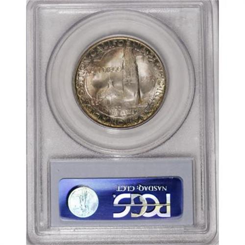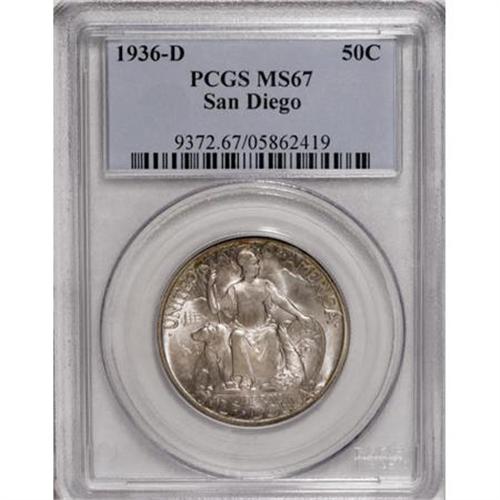 <B>1936-D 50C San Diego MS67 PCGS.</B></I> The obverse of this attractive San Diego coin is primarily silver-blue, while peach shadings are more prevalent on the reverse. Marvelous preservation and swirling luster combine for spectacular visual appeal. Tied for the finest graded by PCGS (1/08).<BR><BR><b>Shipping:</b> Coins & Currency (<a target="_blank" href="http://www.heritageauctions.com/common/shipping.php">view shipping information</a>)