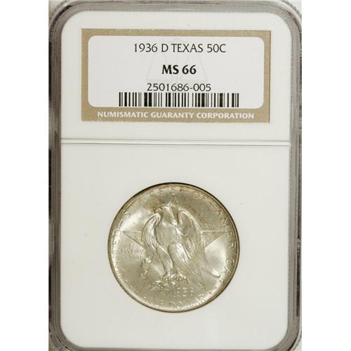<B>1936-D 50C Texas MS66 NGC.</B></I> NGC Census: (601/216). PCGS Population (806/268). Mintage: 9,039. Numismedia Wsl. Price: $320. (#9387)<BR><BR><b>Shipping:</b> Coins & Currency (<a target="_blank" href="http://www.heritageauctions.com/common/shipping.php">view shipping information</a>)