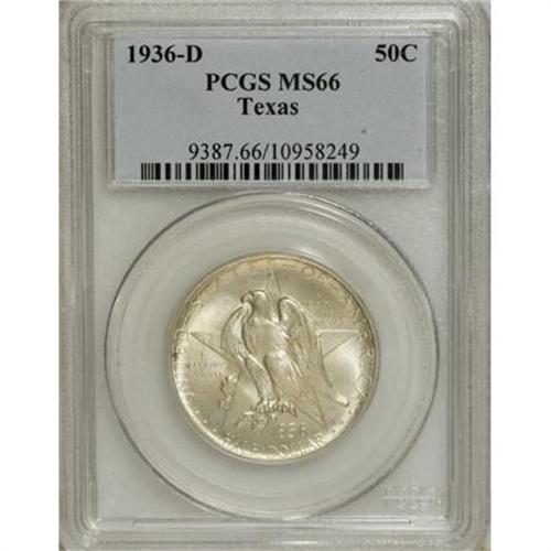 <B>1936-D 50C Texas MS66 PCGS.</B></I> PCGS Population (828/287). NGC Census: (617/232). Mintage: 9,039. Numismedia Wsl. Price for NGC/PCGS coin in MS66: $380. (#9387)<BR><BR><b>Shipping:</b> Coins & Currency (<a target="_blank" href="http://www.heritageauctions.com/common/shipping.php">view shipping information</a>)