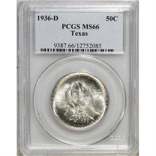 <B>1936-D 50C Texas MS66 PCGS.</B></I> PCGS Population (850/296). NGC Census: (625/228). Mintage: 9,039. Numismedia Wsl. Price for NGC/PCGS coin in MS66: $380. (#9387)<BR><BR><b>Shipping:</b> Coins & Currency (<a target="_blank" href="http://www.heritageauctions.com/common/shipping.php">view shipping information</a>)
