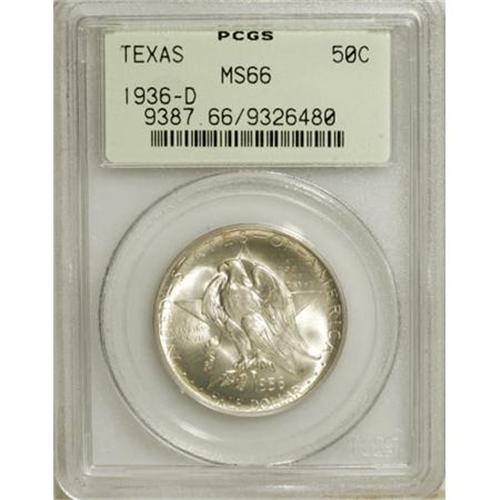 <B>1936-D 50C Texas MS66 PCGS.</B></I> PCGS Population (850/296). NGC Census: (625/228). Mintage: 9,039. Numismedia Wsl. Price for NGC/PCGS coin in MS66: $380. (#9387)<BR><BR><b>Shipping:</b> Coins & Currency (<a target="_blank" href="http://www.heritageauctions.com/common/shipping.php">view shipping information</a>)
