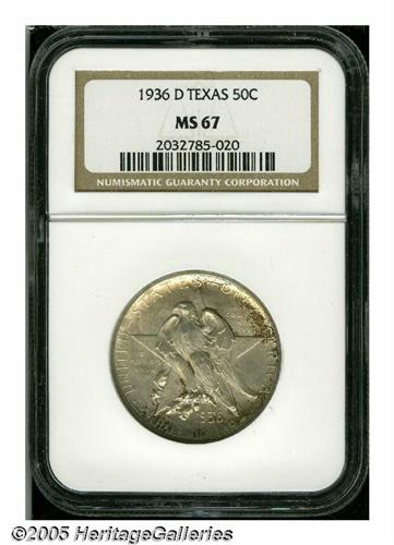 <B>1936-D<50C> Texas MS67 NGC.</B></I> Sharply struck and satiny, with champagne-colored surfaces that are well preserved, nearly free of marks, and reveal mottled russet patina near the borders on each side. A highly attractive, conditionally scarce Superb Gem, and only four pieces have been graded finer, by PCGS (5/05).<BR><I>From the Dr. Kurt Peters Collection.</B></I> From the Dr. Kurt Peters Collection.