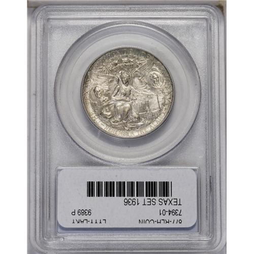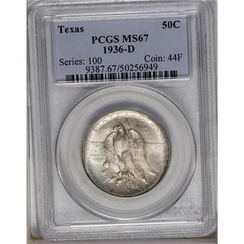 <B>1936-D<50C> Texas MS67 PCGS.</B></I> Attractive luster with a blush of rose on the eagle and slightly hazy fields. A sharply struck and pleasing Superb Gem with no noteworthy marks.