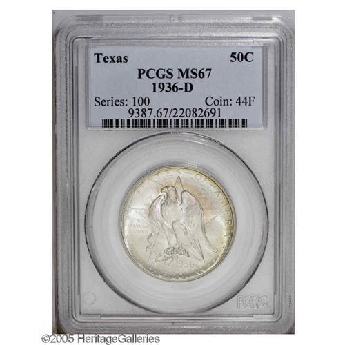1936-D 50C Texas MS67 PCGS. Fully struck with flashy, 1936-D[50C] Texas MS67 PCGS.
