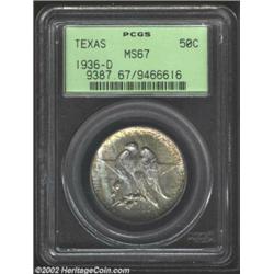 1936-D 50C Texas MS67 PCGS. Richly variegated lilac, apple-green, ruby-red, and gold patina. A sharp