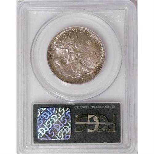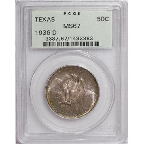 <B>1936-D 50C Texas MS67 PCGS.</B></I> Plum-red central areas are framed by sea-green and gold across the peripheries. Nary a mark is to be found on this solidly struck Superb Gem. Certified in a green label holder.<BR><I>From The Cary & Cheryl Porter Collection, Part Three.</B></I><BR><BR><b>Shipping:</b> Coins & Currency (<a target="_blank" href="http://www.heritageauctions.com/common/shipping.php">view shipping information</a>\)