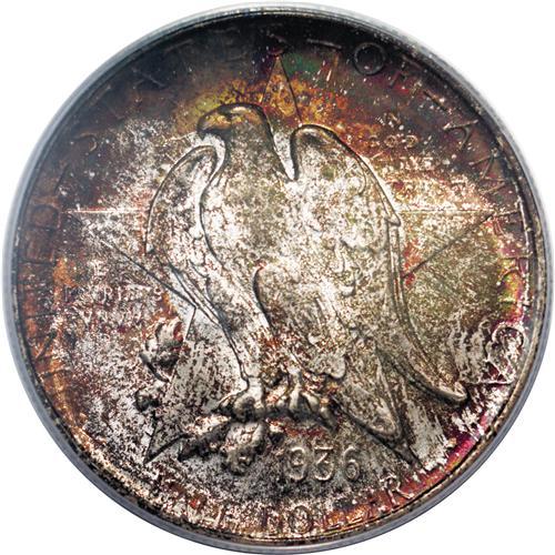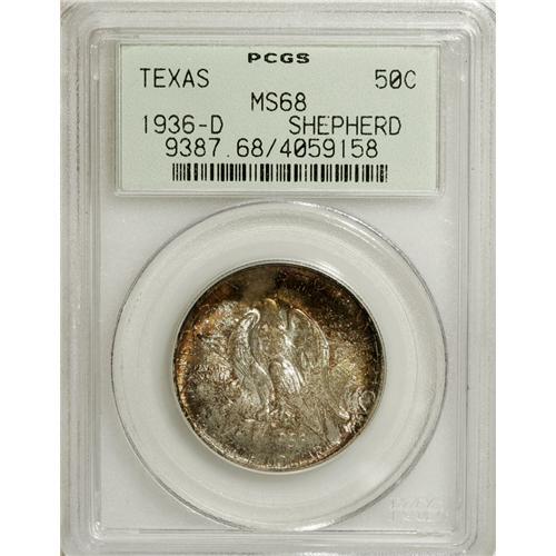 <B>1936-D 50C Texas MS68 PCGS.</B></I> Ex: Shepherd. A phenomenally toned coin of this issue from the mintage of 9,039 pieces, with smoke-gray, cerise, and magenta obverse hues that deepen on the reverse to unusual but completely original ice-blue and copper-russet shades. Certified in a green-label holder.<BR><BR><b>Shipping:</b> Coins & Currency (<a target="_blank" href="http://www.heritageauctions.com/common/shipping.php">view shipping information</a>)