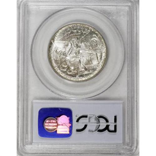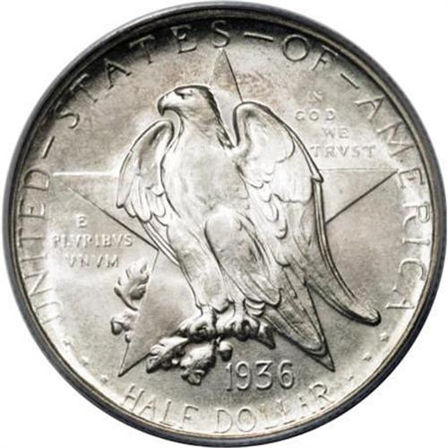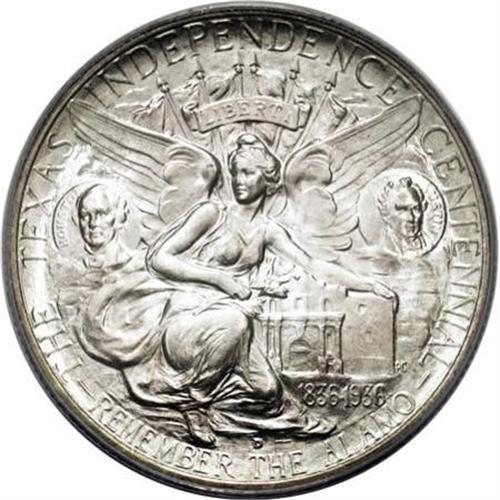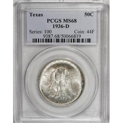 <B>1936-D 50C Texas MS68 PCGS.</B></I> Light tawny-gold and sky-blue toning endows this lustrous and essentially pristine Superb Gem. The Winged Victory has pleasing sharpness, with only a trace of inexactness on the upper knee and the left (facing) hand. 1936 was the true centennial of Texan independence, although the type was struck each year between 1934 and 1938. Population: 12 in 68, 0 finer (9/07).<BR><I>From The Sterling Collection.</B></I><BR><BR><b>Shipping:</b> Coins & Currency (<a target="_blank" href="http://www.heritageauctions.com/common/shipping.php">view shipping information</a>)