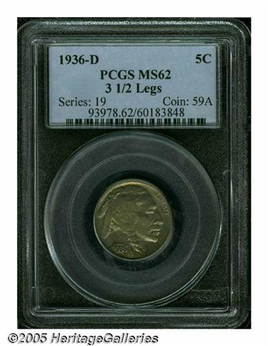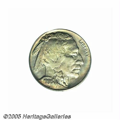 <B>1936-D<5C> 3 1/2 Legs MS62 PCGS.</B></I> This coin is currently the finest graded of this very rare variety. The surfaces are clean and lustrous, with ample luster to please the eye. Furthermore, the periphery is bathed in colorful iridescent toning, particularly so on the reverse, while the centers are more typically yellow with a hint of nickel blue. As to the strike it is average with slight weakness on the tail and head of the bison. What makes this variety so desirable is the lack of a significant portion of the bison's foreleg, which suffered a similar indignity as found on the following years more famous "Three Legged" version. Apparently the dies had clashed or cracked, and were judiciously lapped to the degree that the leg was partially effaced, much to the delight of specialists today. PCGS has graded a mere 21 examples of this variety in all grades, and this one is the only mint state coin yet certified by that service. An important opportunity for the advanced collector to obtain what may be the only Uncirculated example of this variety.
