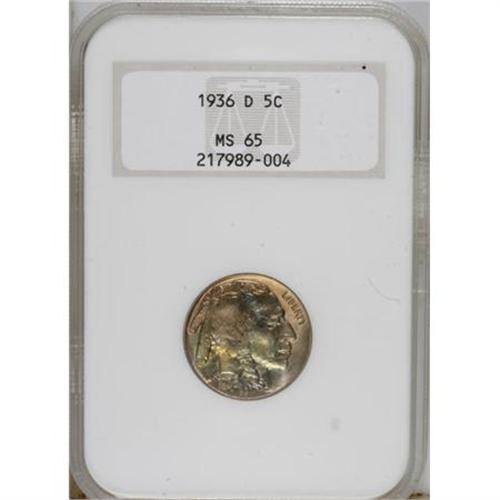 <B>1936-D 5C MS65 NGC.</B></I> NGC Census: (777/587). PCGS Population (1391/680). Mintage: 24,814,000. Numismedia Wsl. Price for NGC/PCGS coin in MS65: $92. (#3978)<BR><BR><b>Shipping:</b> Coins & Currency (<a target="_blank" href="http://www.heritageauctions.com/common/shipping.php">view shipping information</a>)
