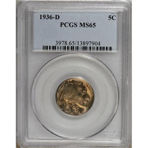 <B>1936-D 5C MS65 PCGS.</B></I> PCGS Population (1391/680). NGC Census: (779/587). Mintage: 24,814,000. Numismedia Wsl. Price for NGC/PCGS coin in MS65: $92. (#3978)<BR><BR><B>Coin Engraver:</B> James E. Fraser<BR><BR><b>Shipping:</b> Coins & Currency (<a target="_blank" href="http://www.heritageauctions.com/common/shipping.php">view shipping information</a>\)