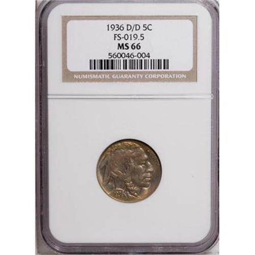 <B>1936-D/D 5C MS66 NGC.</B></I> FS-019.5. NGC Census: (577/10). PCGS Population (628/58). Mintage: 24,814,000. Numismedia Wsl. Price for NGC/PCGS coin in MS66: $208. (#3978)<BR><BR><B>Coin Engraver:</B> James E. Fraser<BR><BR><b>Shipping:</b> Coins & Currency (<a target="_blank" href="http://www.heritageauctions.com/common/shipping.php">view shipping information</a>\)