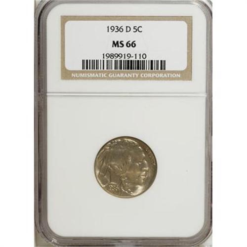 <B>1936-D 5C MS66 NGC.</B></I> NGC Census: (577/10). PCGS Population (628/58). Mintage: 24,814,000. Numismedia Wsl. Price for NGC/PCGS coin in MS66: $208. (#3978)<BR><BR><B>Coin Engraver:</B> James E. Fraser<BR><BR><b>Shipping:</b> Coins & Currency (<a target="_blank" href="http://www.heritageauctions.com/common/shipping.php">view shipping information</a>\)