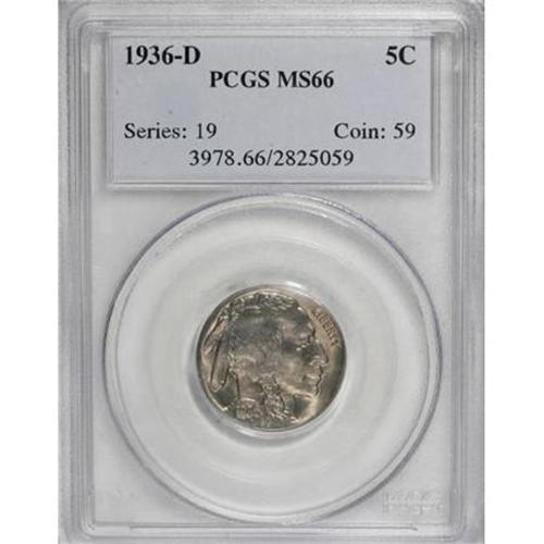 <B>1936-D 5C MS66 PCGS.</B></I> PCGS Population (625/58). NGC Census: (590/10). Mintage: 24,814,000. Numismedia Wsl. Price for NGC/PCGS coin in MS66: $208. (#3978)<BR><BR><B>Coin Engraver:</B> James E. Fraser<BR><BR><b>Shipping:</b> Coins & Currency (<a target="_blank" href="http://www.heritageauctions.com/common/shipping.php">view shipping information</a>)
