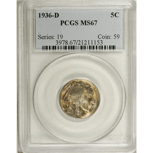 <B>1936-D 5C MS67 PCGS.</B></I> Lovely golden toning with steel-gray highlights covers each side of this lustrous Superb Gem nickel. Boldly struck with just a few areas of minor weakness, and immaculately preserved surfaces. Population: 56 in 67, 2 finer (4/07).<BR><BR><b>Shipping:</b> Coins & Currency (<a target="_blank" href="http://www.heritageauctions.com/common/shipping.php">view shipping information</a>)
