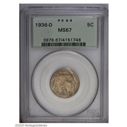 1936-D 5C MS67 PCGS. This apricot tinged survivor is w 1936-D[5C] MS67 PCGS.