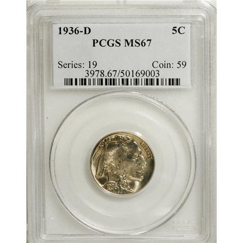 <B>1936-D 5C MS67 PCGS.</B></I> This lovely Superb Gem is immaculately preserved and intensely lustrous, with light toning and bold striking details. Faint doubling is observed on the 1 in the date. Nearly unimprovable quality in a 1936-D Buffalo nickel. Population: 56 in 67, 2 finer (4/07).<BR><BR><b>Shipping:</b> Coins & Currency (<a target="_blank" href="http://www.heritageauctions.com/common/shipping.php">view shipping information</a>)