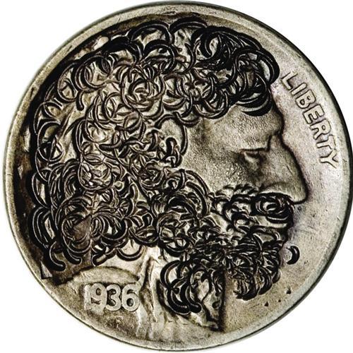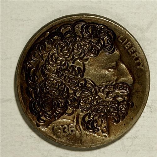 <B>1936-D:</B></I> Another post-1957 original by "Bo," and quite similar to the 1929-D, this may be a depiction of Methuselah or some other Biblical person. The curly hair and beard on this darkened carving (Average grade on a Very Fine host coin) offers a rather attractive image. Population: 0 in 40, 0 finer (12/06).<BR><BR><b>Shipping:</b> Coin/Currency (<a target="_blank" href="http://www.heritageauctions.com/common/shipping.php">view shipping information</a>)