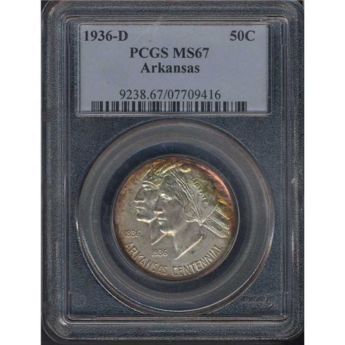 From a mintage of 9,660 coins. Some lovely crimson color at the rim. The otherwise silvery hue deepens to golden and pinkish shades in areas. A superb gem of this Type. Struck to commemorate the 100th anniversary of the admission of Arkansas to the Union, June 15, 1836. Two Art Deco heads are Liberty and (evidently) a Quapaw Indian, the tribe that inhabited what would become the Territory of Arkansaw. Edward Everett Burr designed the piece along with the help of several others. Sets of three, one from each mint, were sold in 1935-39 at ever-escalating prices. There was active speculation in the issue at the time, along with the other P-D-S commemorative sets struck during the 1930s. One of eighteen graded , none finer by either service.