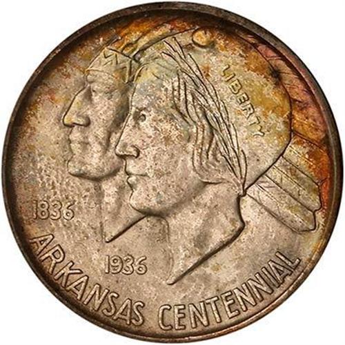 An intensely beautiful Arkansas half dollar, a coin with superb luster and a strike that is amazingly close to complete. Colorful reddish amber toning suggests that the present specimen spent much of its life in an original issue envelope or card. Superb!