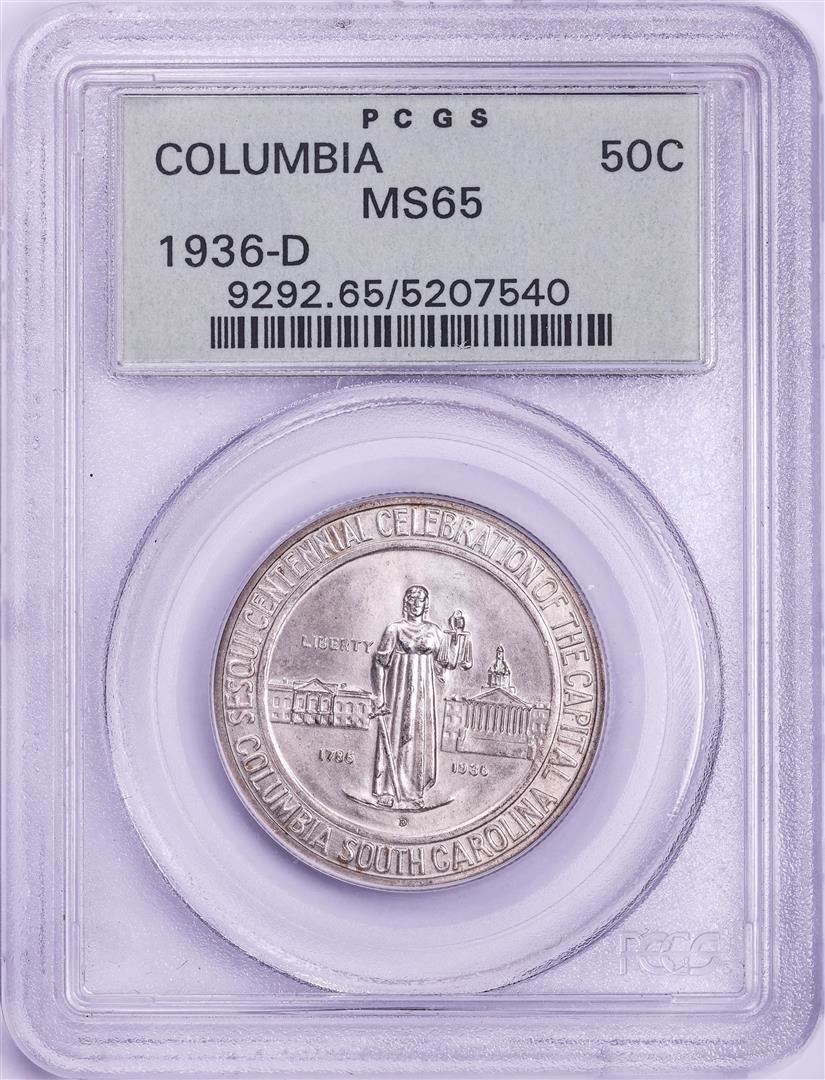 One 1936-D Columbia Sesquicentennial Commemorative Half Dollar Coin PCGS MS65 OGH. PCGS Graded.