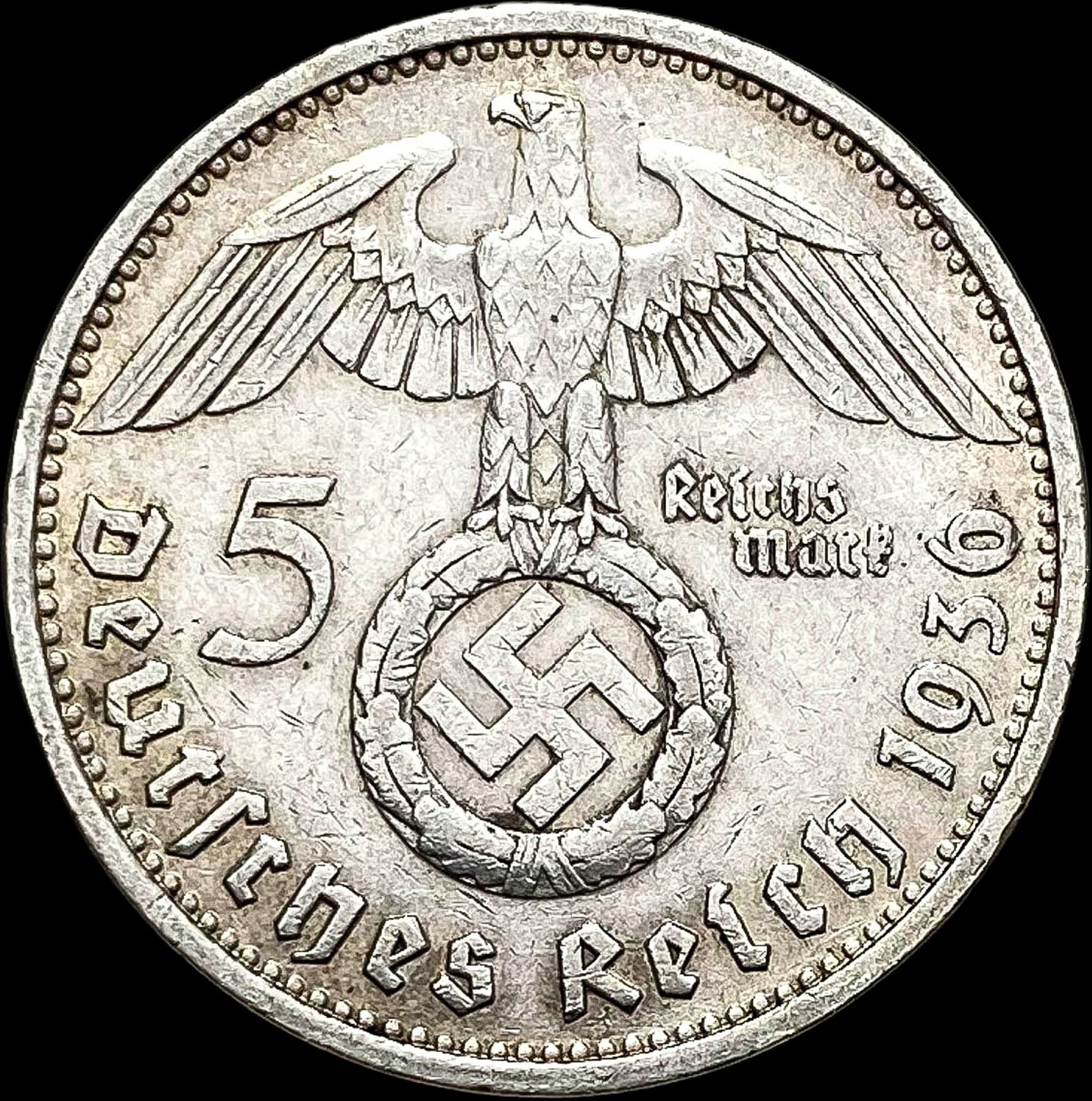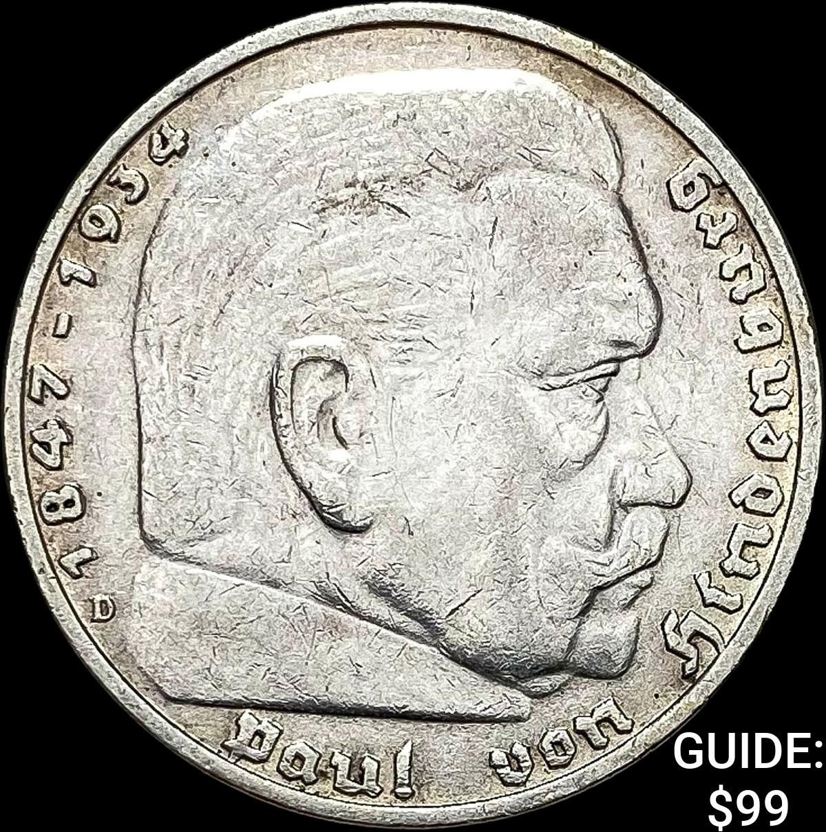 1936-D Germany Silver 5 Reichsmark CLOSELY UNCIRCULATED
