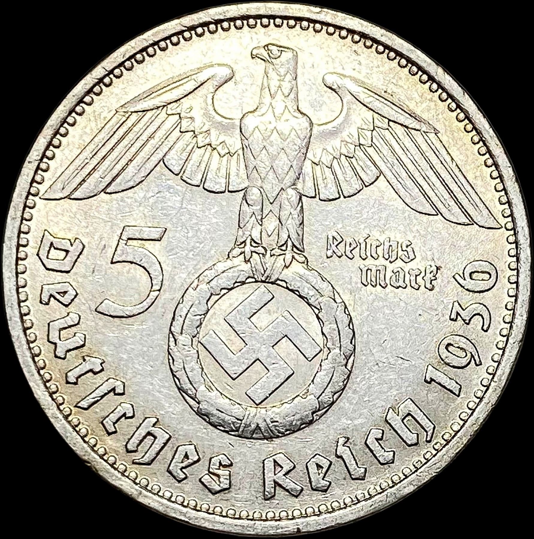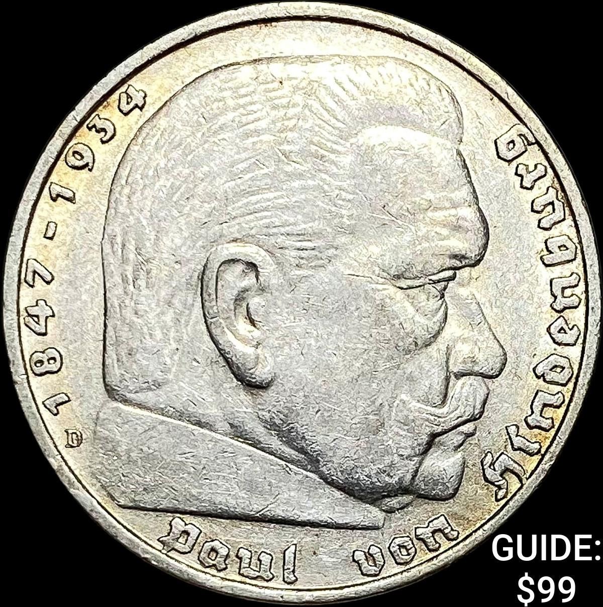 1936-D Germany Silver 5 Reichsmark CLOSELY UNCIRCULATED