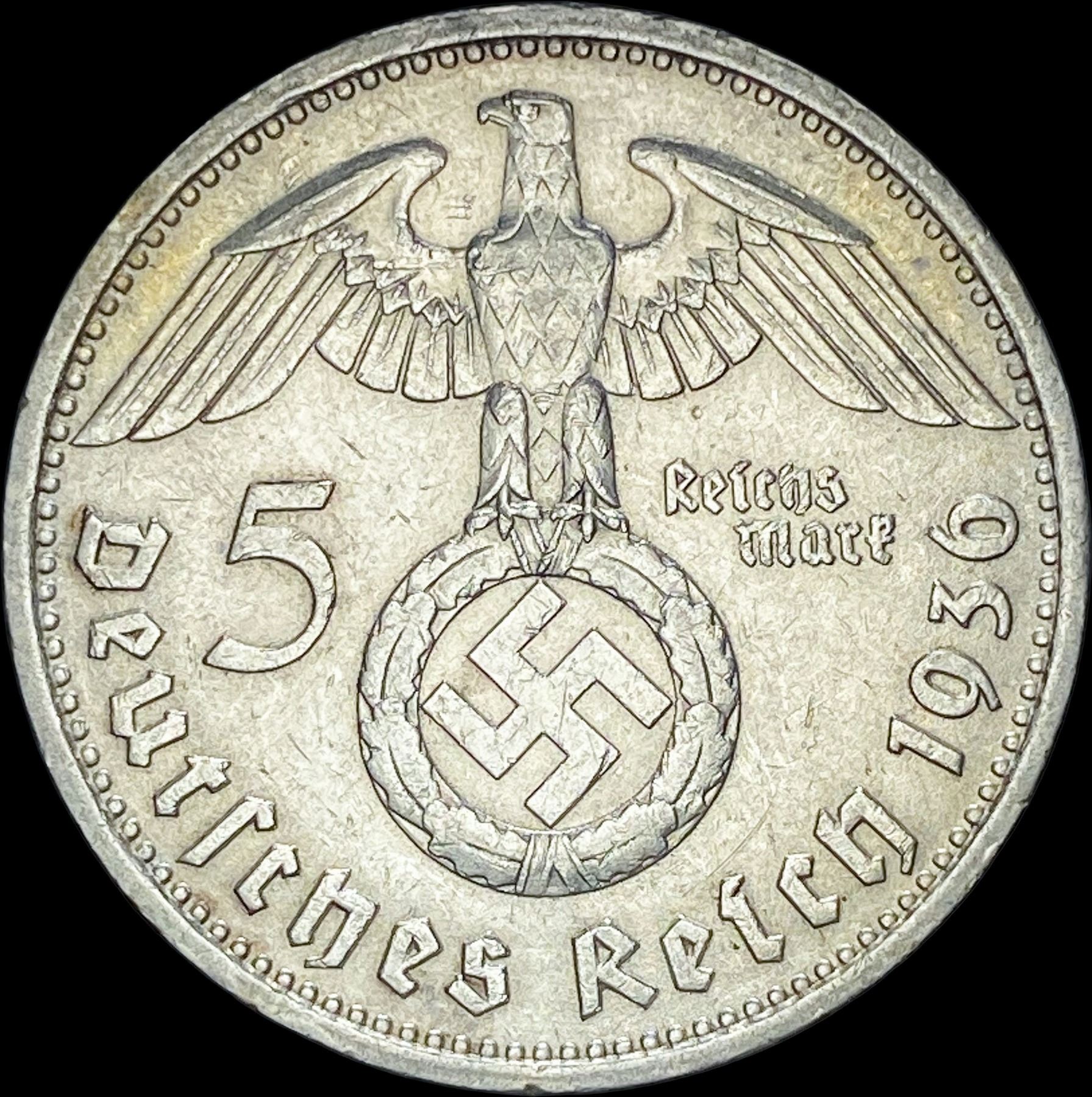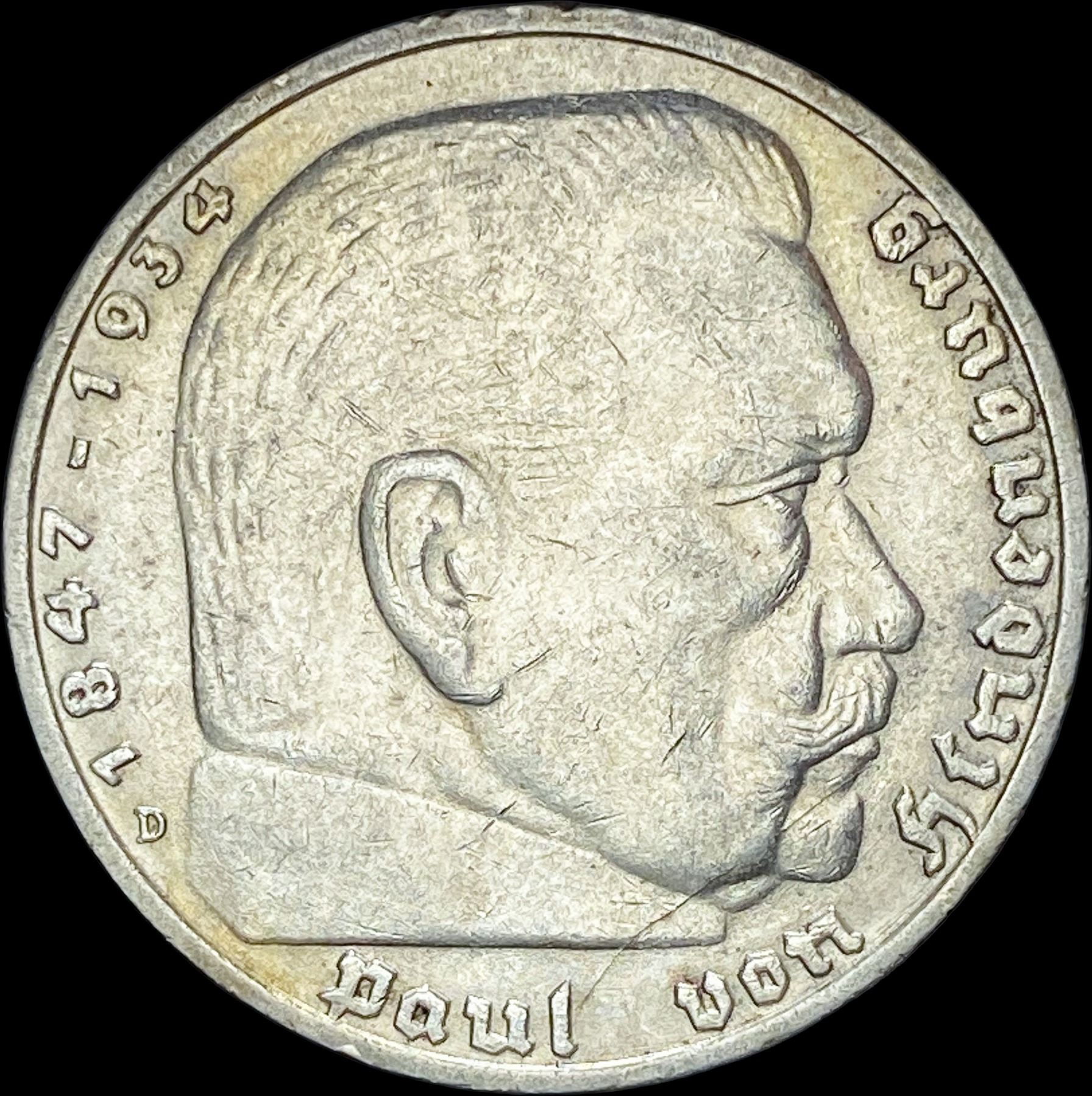 1936-D Germany Silver 5 Reichsmark CLOSELY UNCIRCULATED
