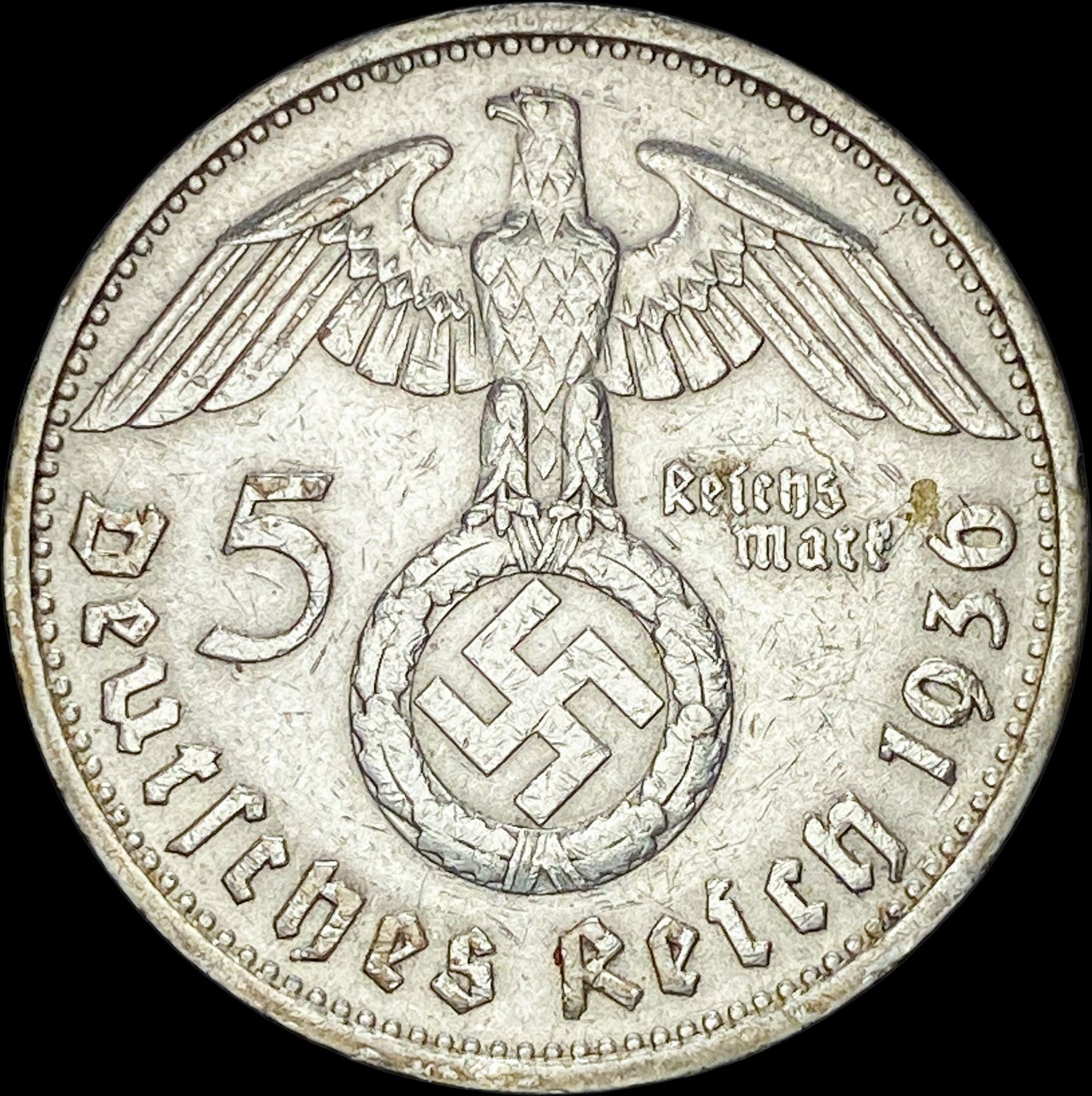 1936-D Germany Silver 5 Reichsmark CLOSELY UNCIRCULATED