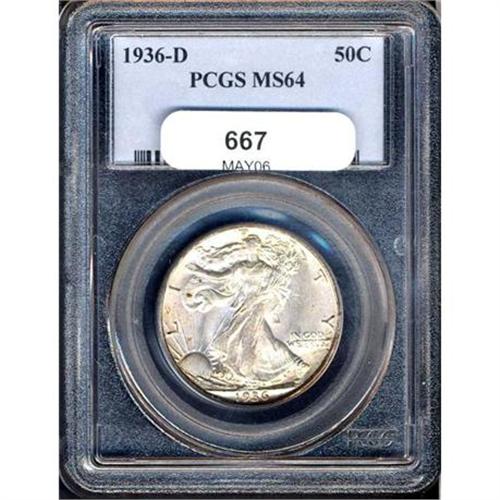 <b>1936-D Liberty Walking Half Dollar. PCGS graded MS64.</b> Lightly toned and glistening with mint frost <b>(PCGS # 6599)</b> <i>