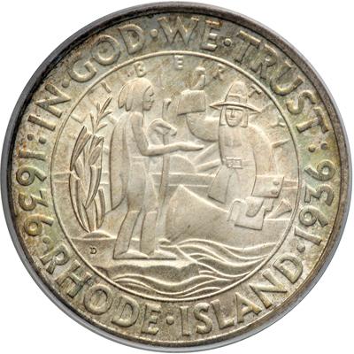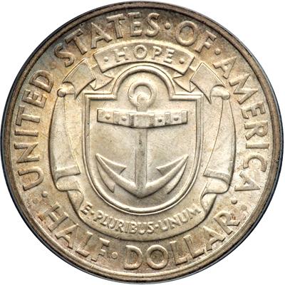 1936-D Rhode Island Half Dollar. PCGS graded MS-67. Old green holder. Nice light even toning on both sides. Easily the most visually arresting feature of this coin is its soft, frosted mint luster. Full swirling luster throughout, in fact. Pop 43; none finer at PCGS. (PCGS # 9364).