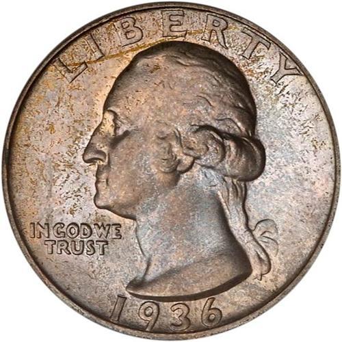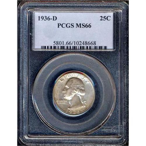 <b>1936-D Washington Quarter Dollar. PCGS graded MS66.</b> Incredible satiny perfection in the devices and lightly toned fields. Razor-sharp on all devices <b>(PCGS # 5801)</b> <i>