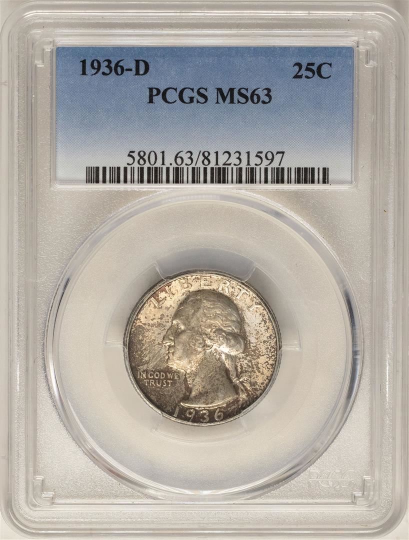 One 1936-D Washington Quarter Coin PCGS MS63. PCGS Graded.