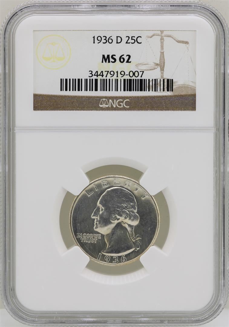 One 1936-D Washington Silver Quarter Coin NGC MS62. NGC Certified.