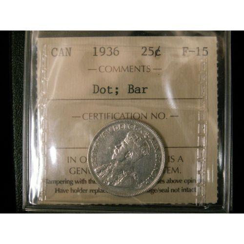 1936 DOT and BAR 25¢ ICCS F-15, brilliant. B