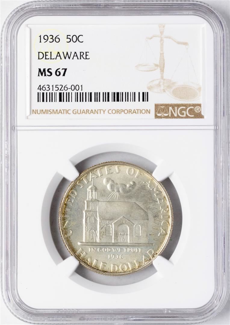 One 1936 Delaware Tercentenary Commemorative Half Dollar Coin NGC MS67. NGC Certified.