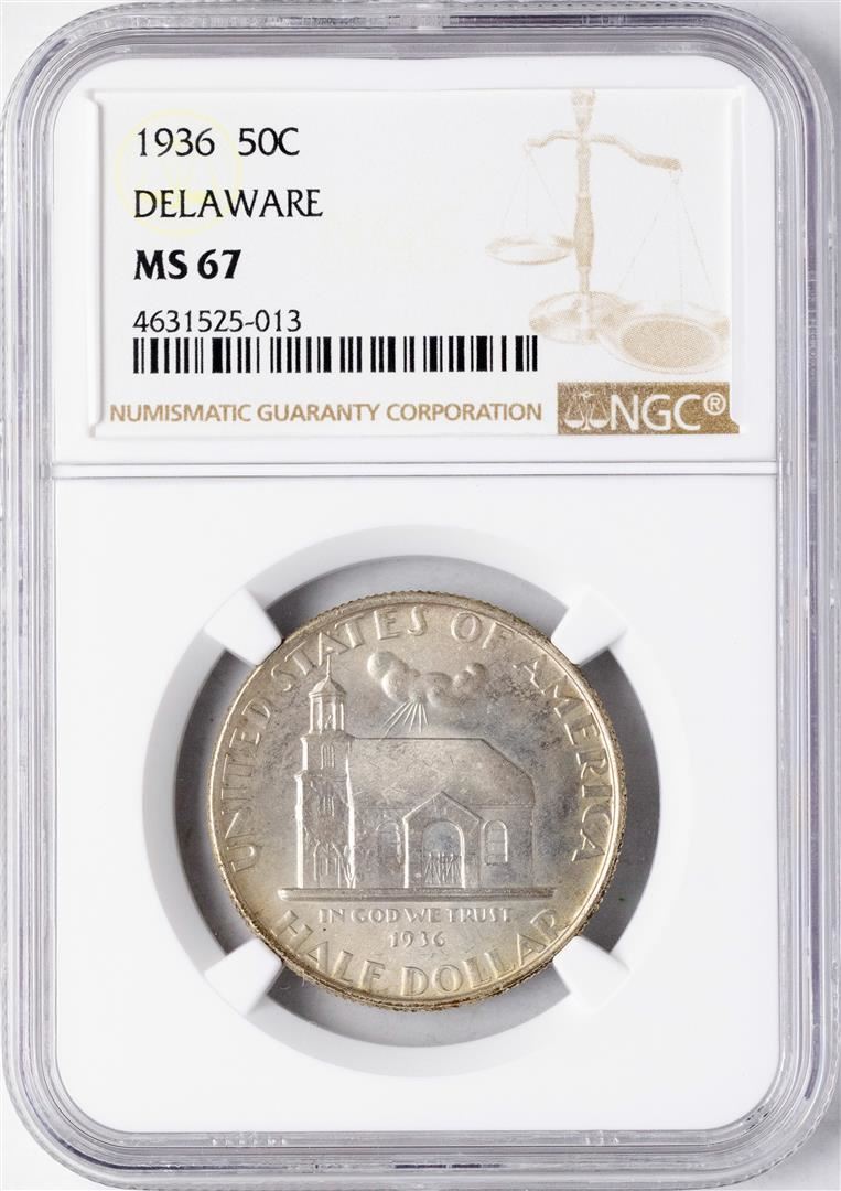 One 1936 Delaware Tercentenary Commemorative Half Dollar Coin NGC MS67. NGC Certified.