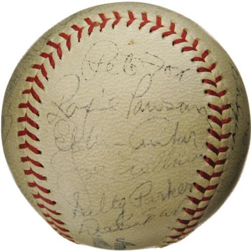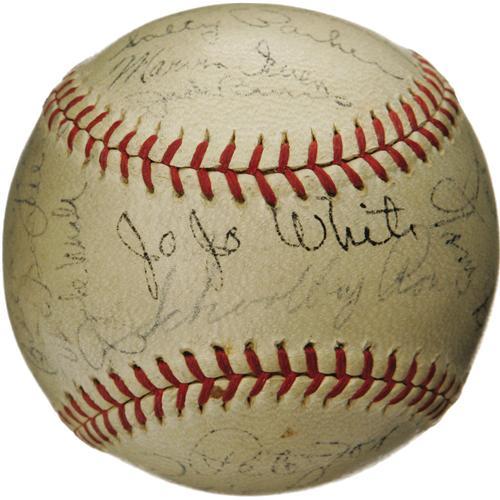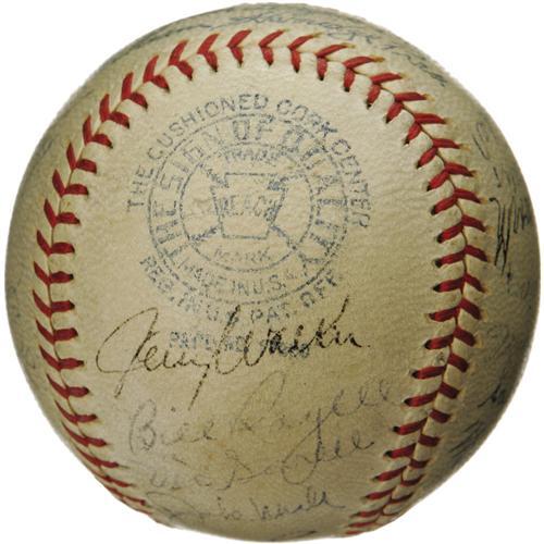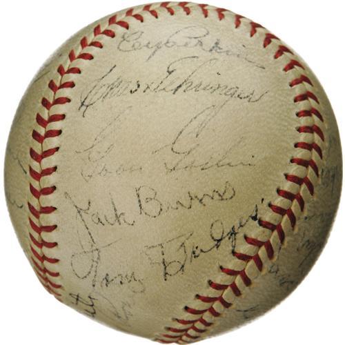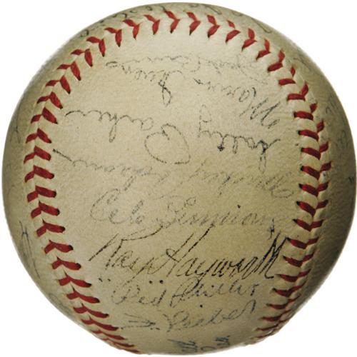 <B>1936 Detroit Tigers Team Signed Baseball.</B></I> The defending World Champs couldn't make it two in a row this season, but this is essentially the same team that won it all in '35. There's no shortage of Hall of Fame talent present on this OAL (Harridge) ball, with Cochrane, Gehringer, Simmons and Goslin all appearing among the twenty-five autographs. White, Rowe and Perkins are here as well. Signature quality averages 6/10, with none dipping below 4/10. Seven signatures have been deemed clubhouse, but none mentioned above. <I>LOA from PSA/DNA. LOA from James Spence Authentication.</B></I><BR><BR><b>Shipping:</b> Balls, Pucks, etc., Small (<a target="_blank" href="http://www.heritageauctions.com/common/shipping.php">view shipping information</a>)