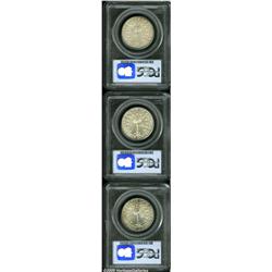 <B>1936<img border='0' src='http://www.heritagecoins.com/images/star.gif' width=10 height=10>ET Columbia PDS Set MS66 PCGS.</B></I> The set includes: <B>1936,</B></I> honey-gold and sky-blue color, satiny and exquisite; <B>1936-D,</B></I> lustrous and bold, a possible fingerprint on the slightly granular reverse at 5 o'clock; and a <B>1936-S,</B></I> wisps of tobacco-brown color, lustrous, a few tiny marks. The holders possess consecutive serial numbers. 3 Coins