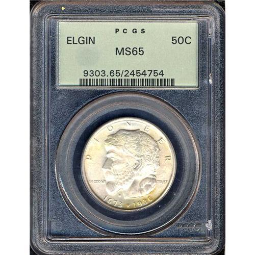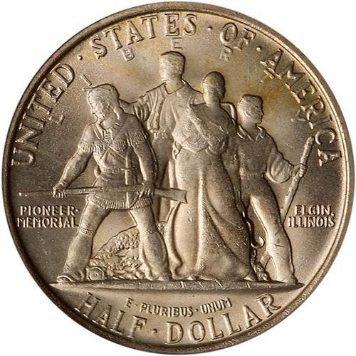 Mintage for this date is only 20,015 coins. Isolated swirls of silvery iridescence confirm the originality of this well-conceived commemorative half dollar. Fully lustrous and quite clean for the issue. Well struck on all devices. In an old PCGS holder. Bids $273 and trends $350.